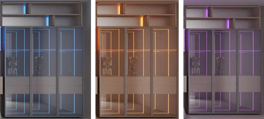 另外,FotileStyle更懂Z世代的收藏欲,量身打造了这款幻彩深渊镜柜。柜内配置RGB灯光,仿佛水折射阳光般的幻彩,还可与发光背板同步变幻;隐藏式接电口,无需挪移,满足需接电手办的展示需求;柜内五金隐藏式安装,视觉更显简洁美观。站在柜前,通过高清镀膜玻璃,可以尽情欣赏从全球收集的心爱手办在光影流转下的不同姿态。更贴心的是,它不再是一个突兀的“展示盒”,而是能与周围柜体同色同高、完美融合,真正成为整体空间的一部分——尊重你的热爱,也守护你的审美。